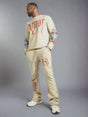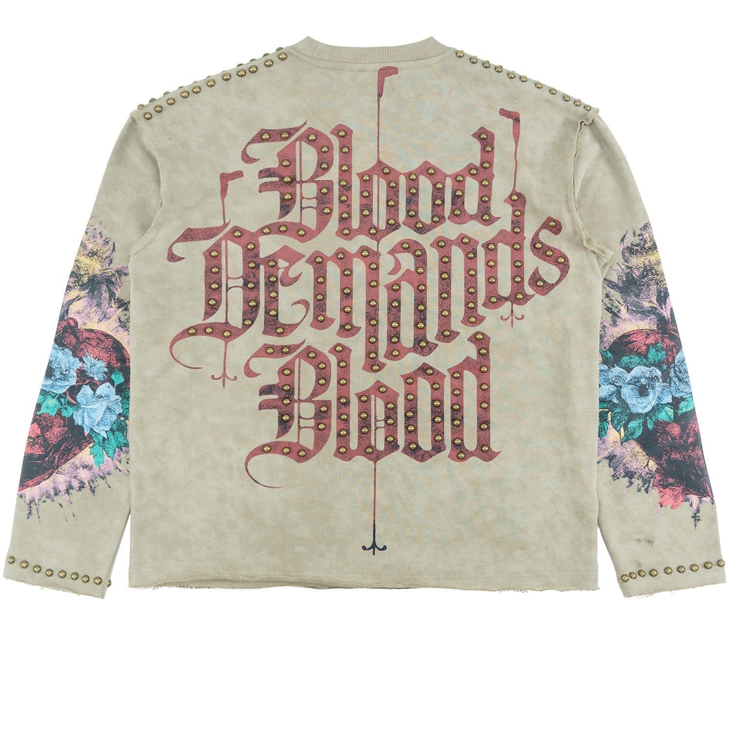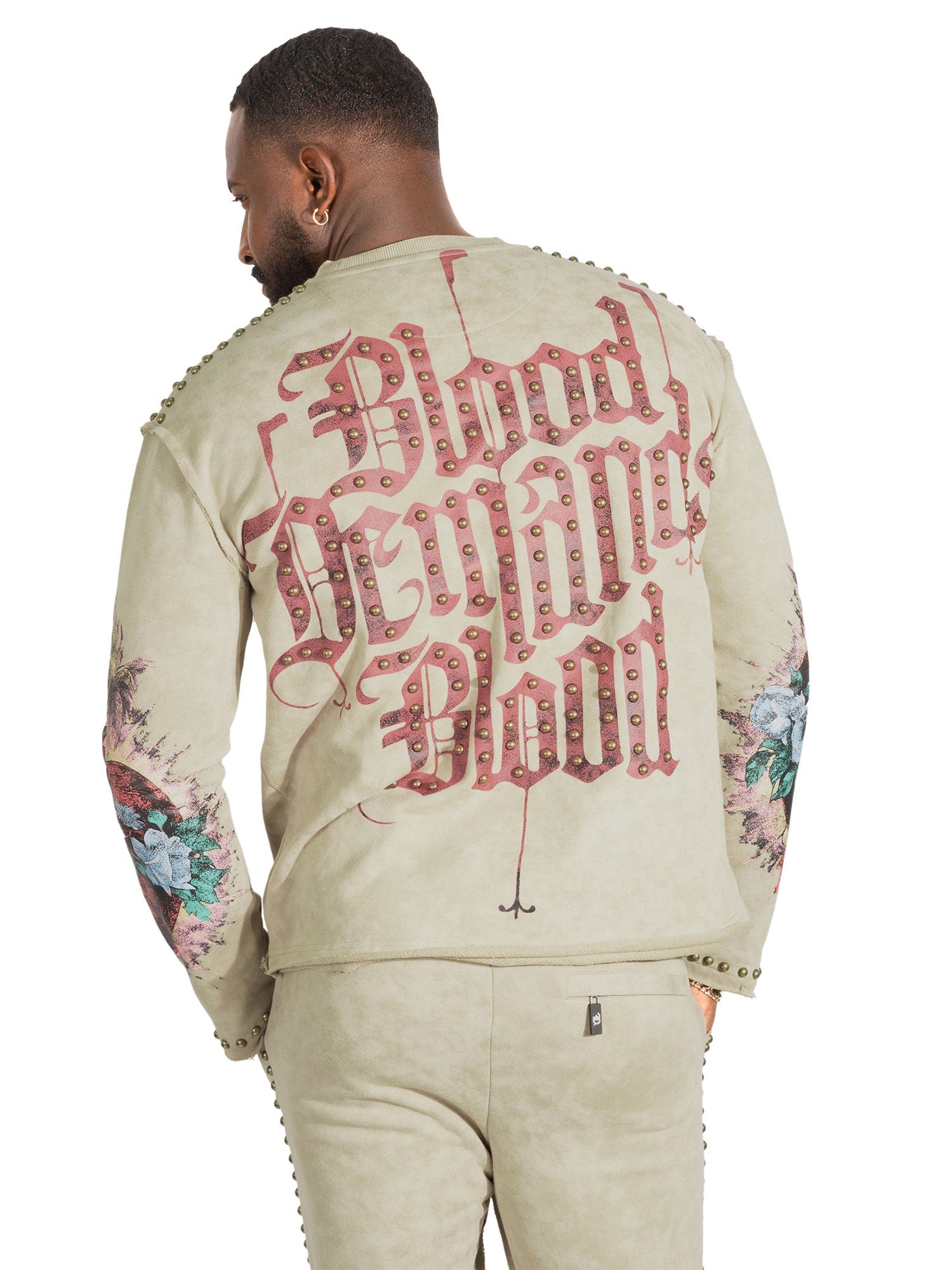 Turn heads in this standout acid-wash co-ord set that fuses vintage flair with modern street grit. The long-sleeve top features an oversized gothic-style “Amor” print across the chest, flanked by bold, high-contrast sacred heart and floral motifs on the sleeves that inject a burst of vibrant red, blue, and green into the muted palette. The back doesn't hold back either, with a heavy-hitting "Blood Demands Blood" statement in ornate blackletter script — pure attitude. Adding edge and luxury, pearl-like studs line the shoulder seams, sleeve cuffs, waistband, and pant legs, offering a glam-rock twist to this rebellious look. The matching joggers keep the energy going with distressed-style typography reading "F.O" on the thigh and a mirrored gothic design running vertically down one leg. Built for comfort with a drawstring waistband, but styled to steal the spotlight.