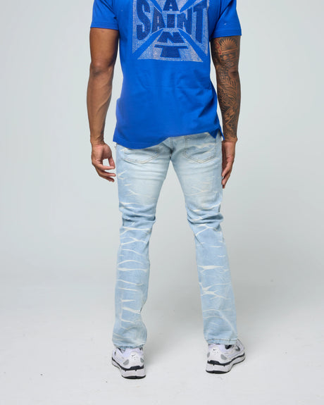 STACK JEANS WITH MULTI RIP & REPAIR LIGHT BLUE