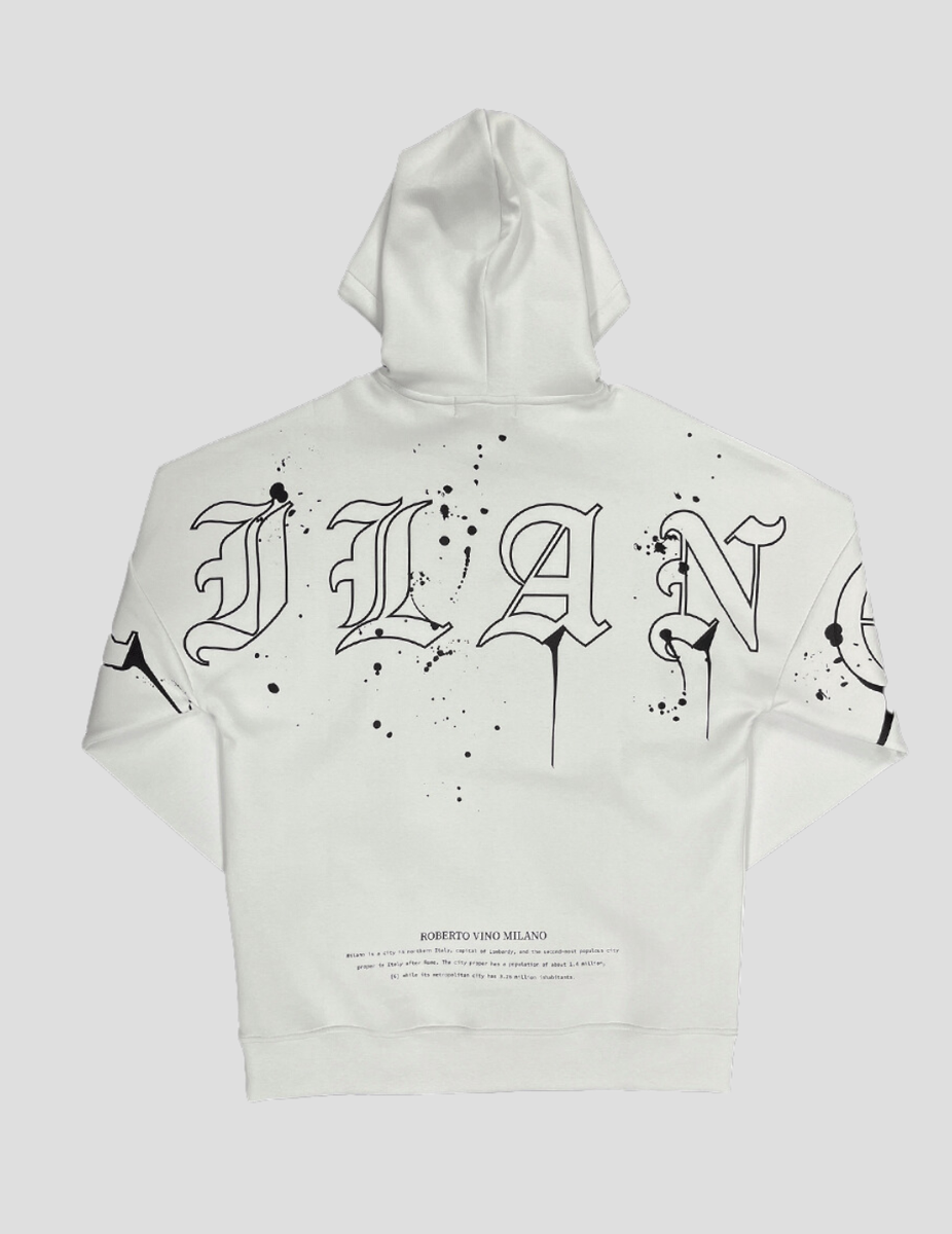 The back is adorned with large "Milano" lettering, accented by an eye-catching paint-splatter effect. Below the lettering, a Roberto Vino Milano inscription captures the essence of the brand's connection to the city of Milan. This hoodie stands out within the Milano collection as both a fashion-forward and statement-making piece.