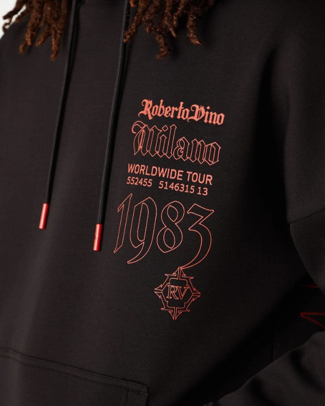 The Roberto Vino Milano World Tour Hoodie blends urban style and comfort, featuring World Tour graphics on the back and an RV logo on the chest. This durable, flexible black hoodie in a regular fit is perfect for everyday wear.
