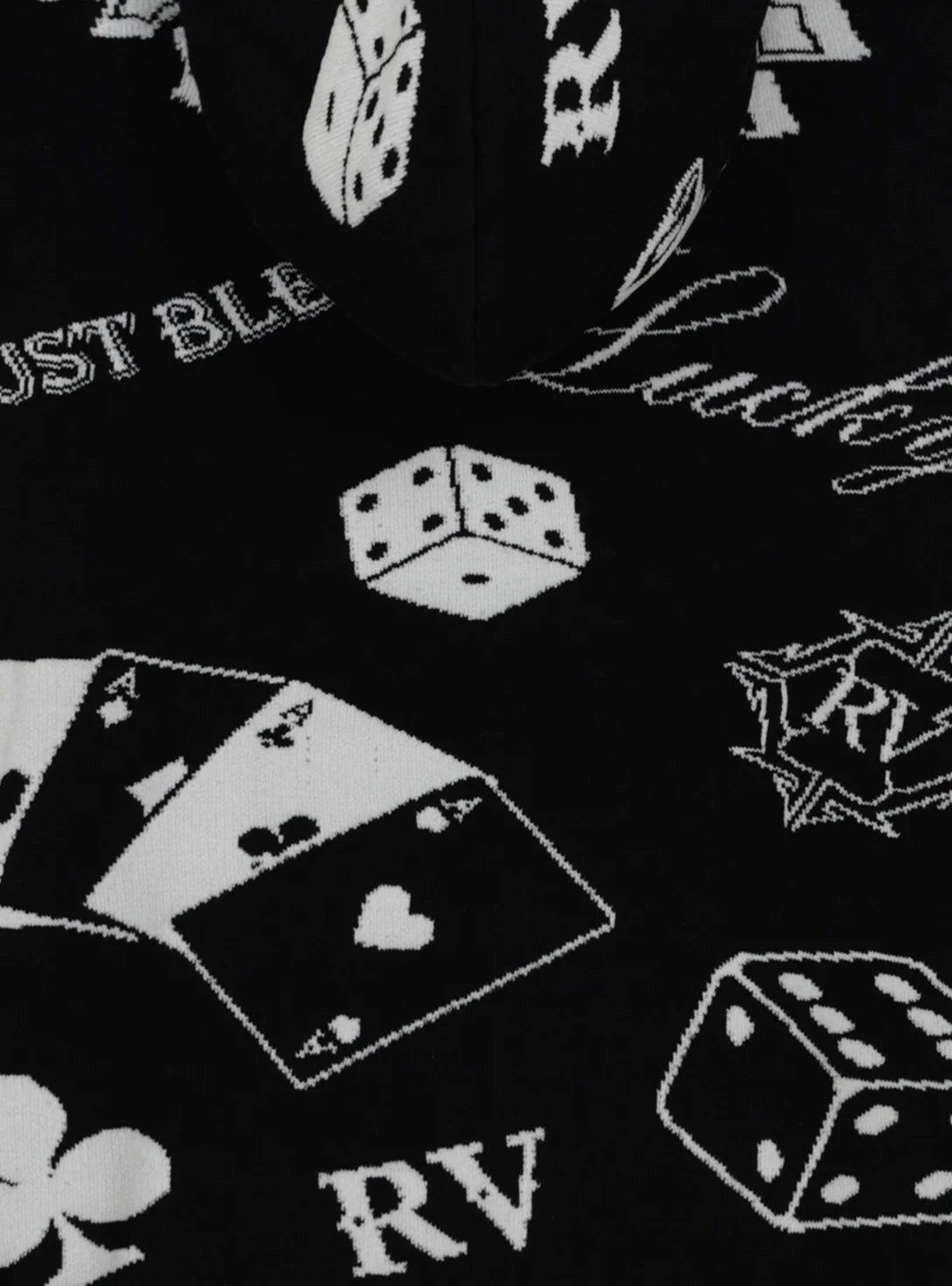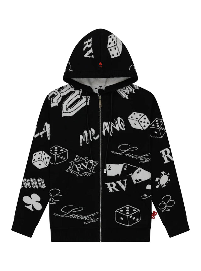 Bring the thrill of the game to your wardrobe with the Milano Games Sweater. This full-zip hoodie is designed with bold, all-over casino-inspired graphics — including dice, playing cards, and iconic "RV" and "Milano" text. Real dice are attached for an added touch of luxury and playful detail that sets this piece apart.