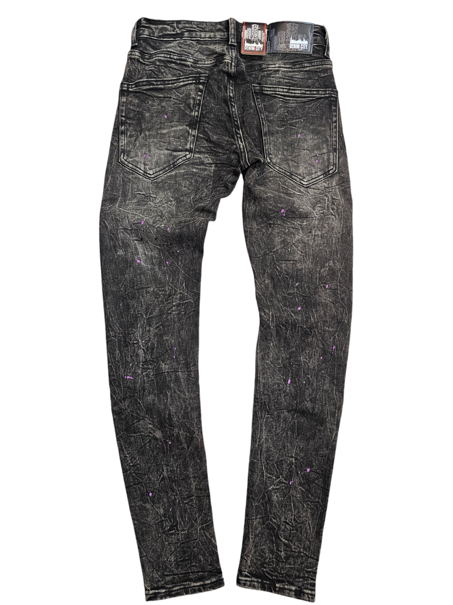 DENIM CITY SKINNY RIP & REPAIR BLACK SNOW WASH PURPLE STITCHES