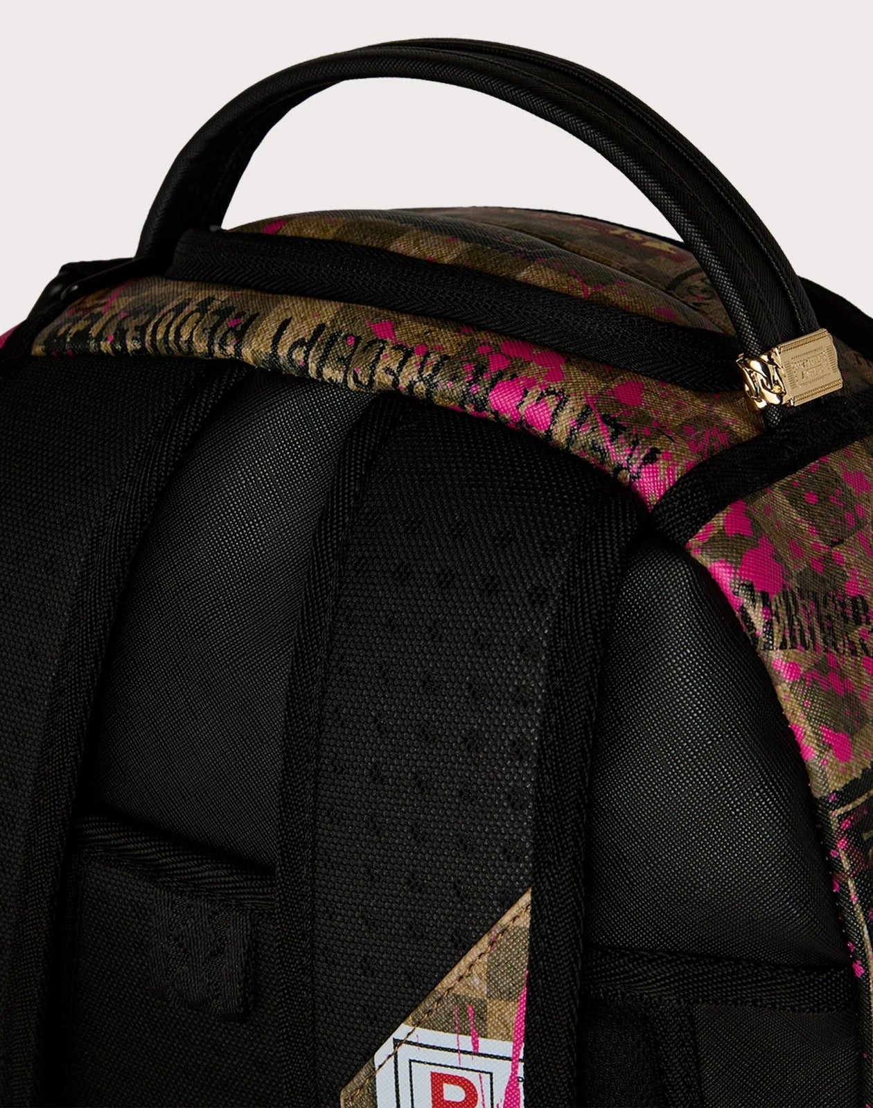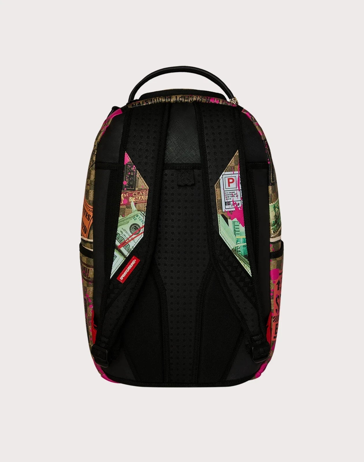 Dimensions: 18" x 6" x 11.5" • Front zipper pocket • Side pockets • Zippered Stash pocket • Separate velour sunglass compartment • Ergonomic mesh back padding • Adjustable Straps for custom sizing • Gold zippers with metal hardware • Metal "Sprayground Authentic" badge • Slide through back sleeve connects to carry-on luggage to free your hands