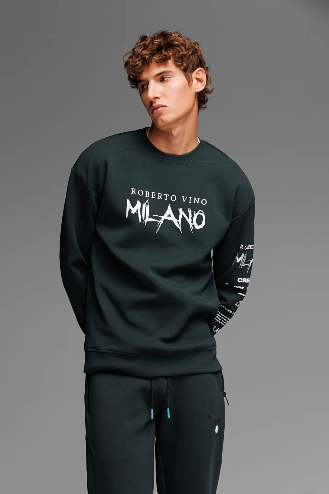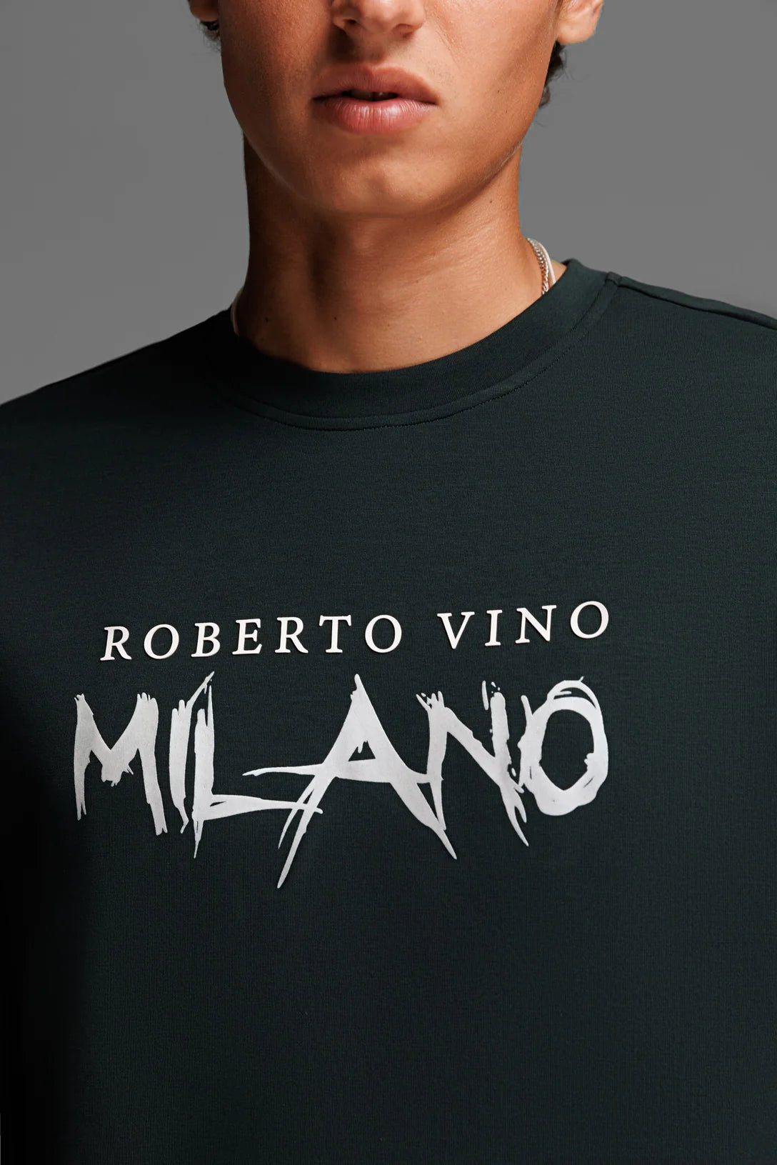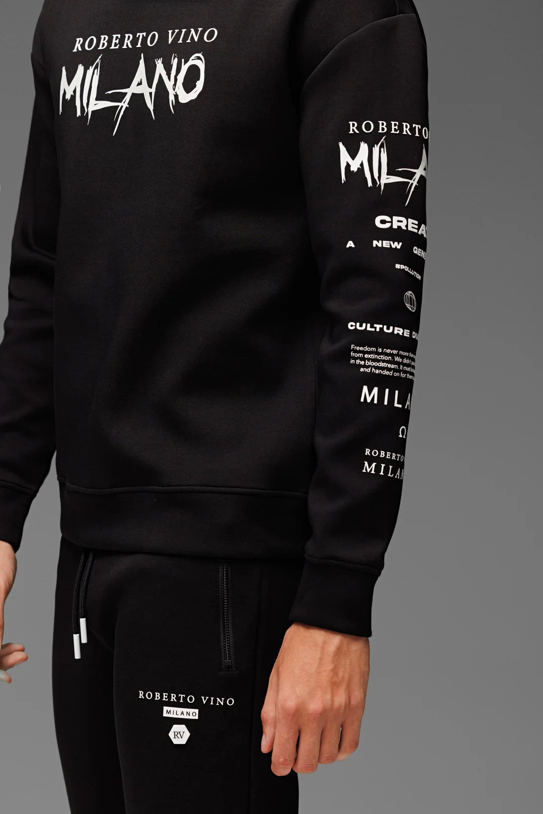 The Milano Sweater from the Milano collection offers a refined blend of comfort and contemporary design. Crafted from a premium mix of 78% cotton, 15% lycra, and 7% polyester, this sweater ensures a soft, flexible, and durable fit. The front features the iconic "Roberto Vino Milano" branding, accented with sleek graphics that add a modern edge to the minimalist design.