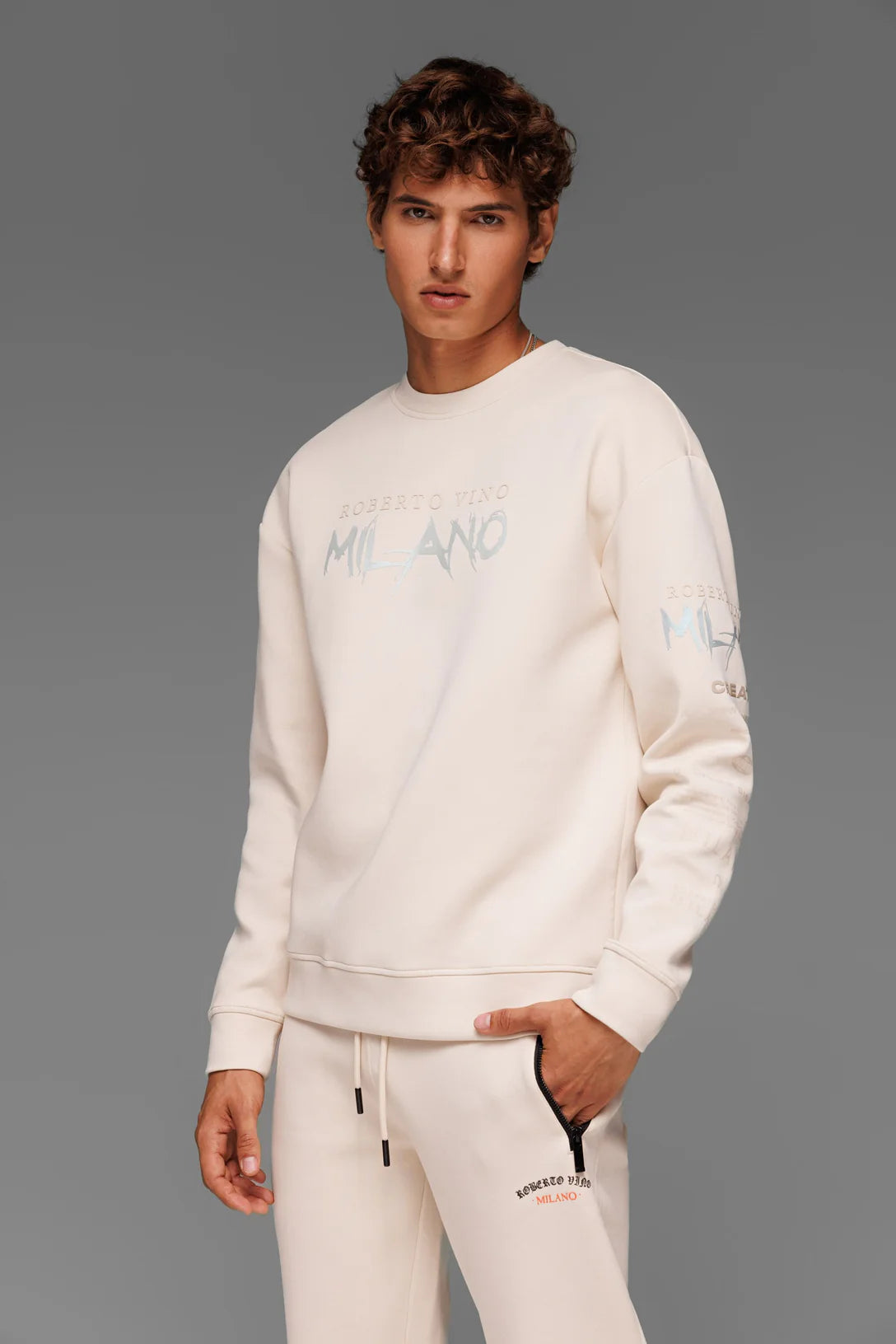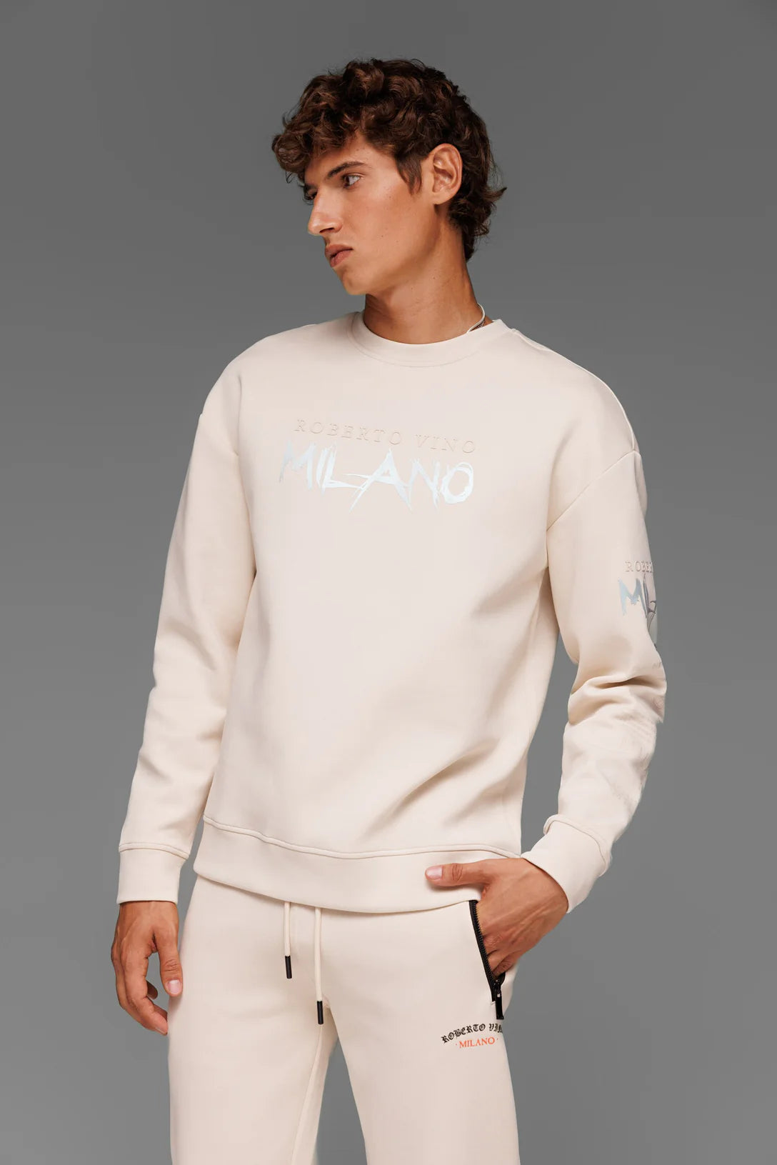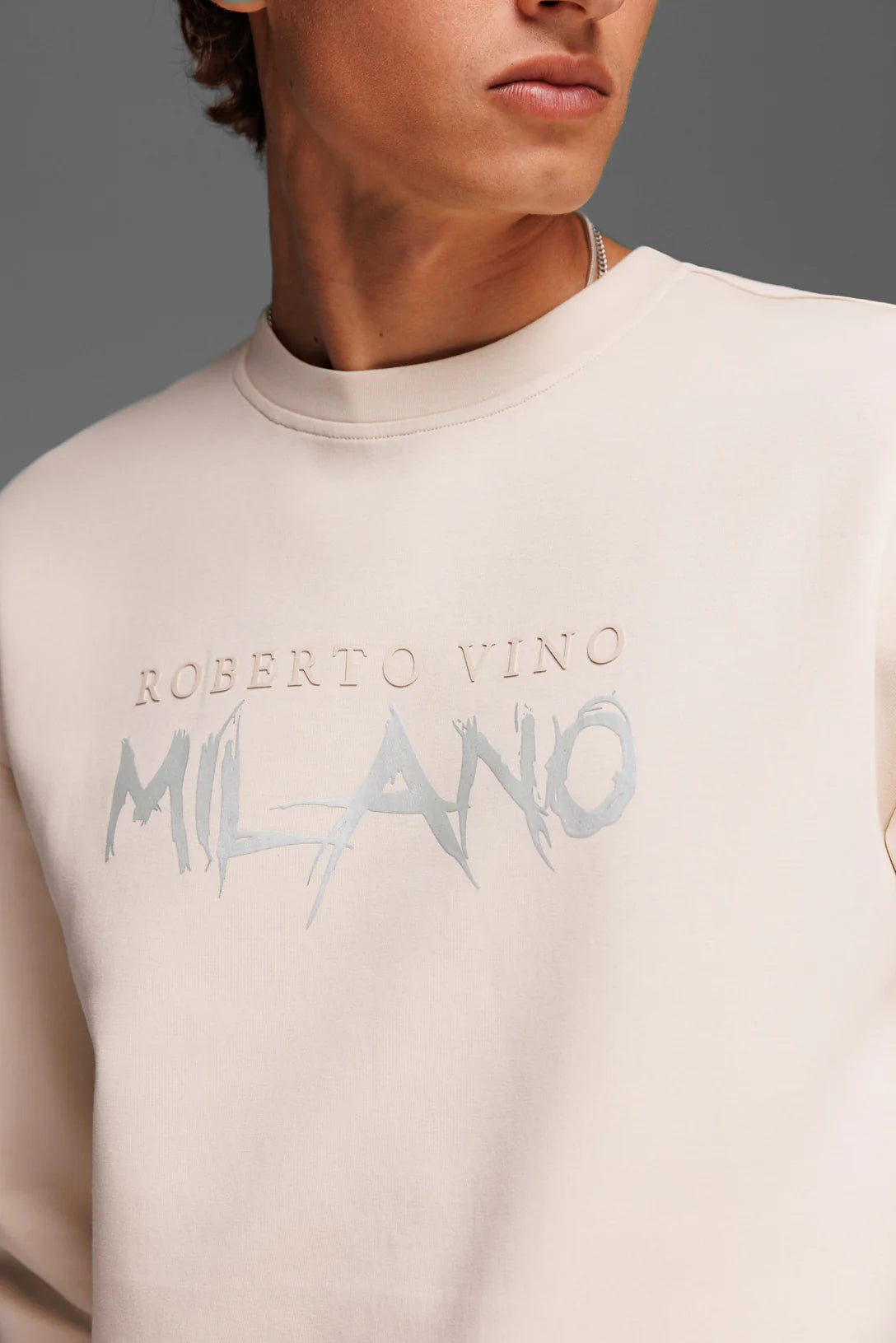 - Beige sweater with "Roberto Vino Milano" branding and graphic details
