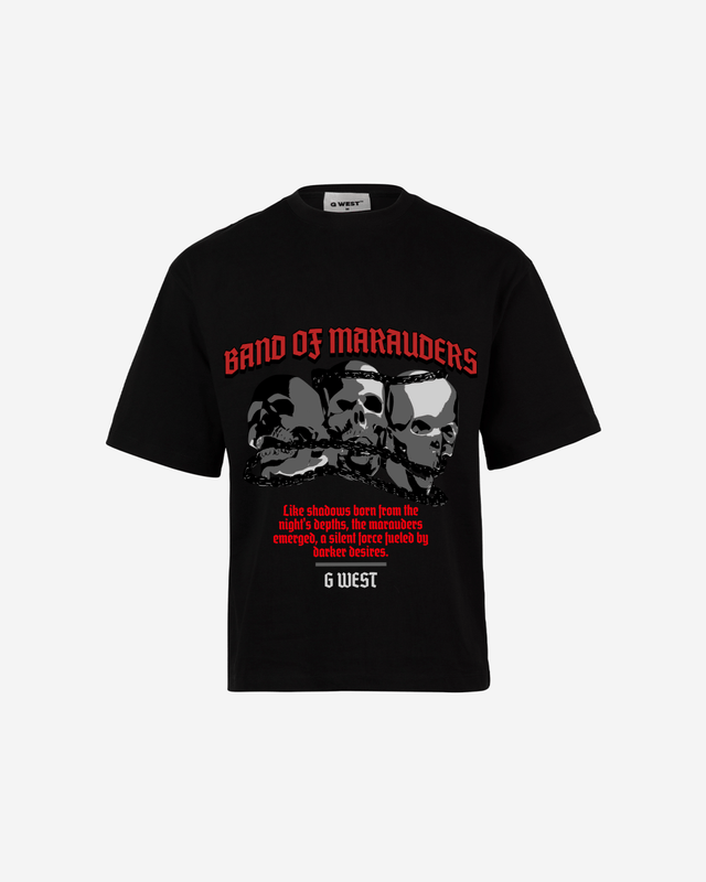 Striking “Band of Marauders†graphic with raw, rebellious vibes