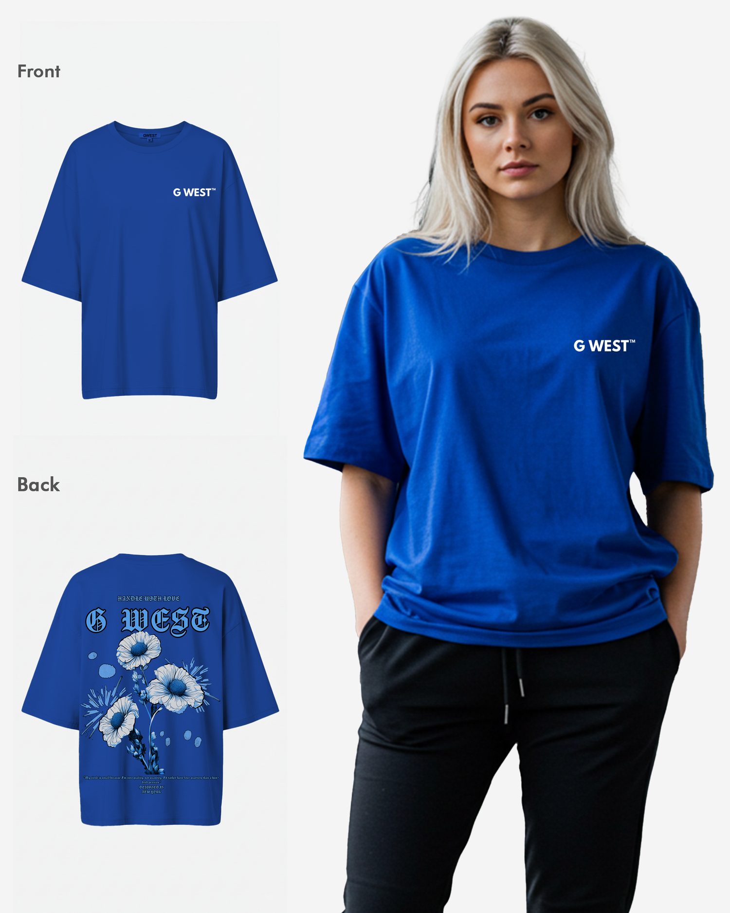 The G West Blue Garden Tee is the perfect way to bring the serenity of nature into your everyday wardrobe. Featuring a delicate garden-inspired graphic in soothing blue tones, this oversized tee captures the calming beauty of nature. Made with soft, breathable cotton, it offers a relaxed fit that ensures comfort no matter where your day takes you. Ideal for women who appreciate tranquility and the natural world, this tee effortlessly combines comfort and style. Whether you're out enjoying nature or simply embracing a peaceful vibe, this tee adds a refreshing and calming element to any outfit.