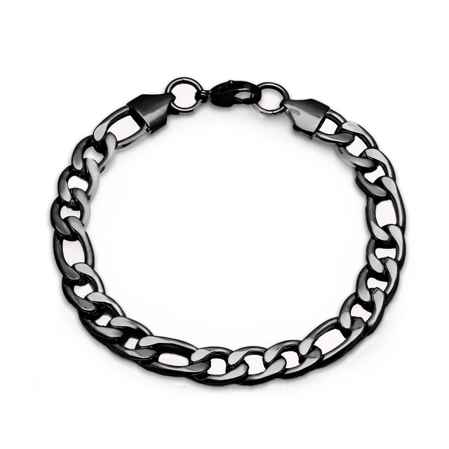 This Classic Figaro Link Bracelet is the go-to staple for a casual wardrobe upgrade. A timeless classic, that has just enough edge to stay on the fashion-front, but creates sleek lines with its off-set alternating open-work links. Made of stainless steel with Black Ion Plating. Wear alone or pair with our Classic Figaro Link Necklace to create a coordinating look of your own.