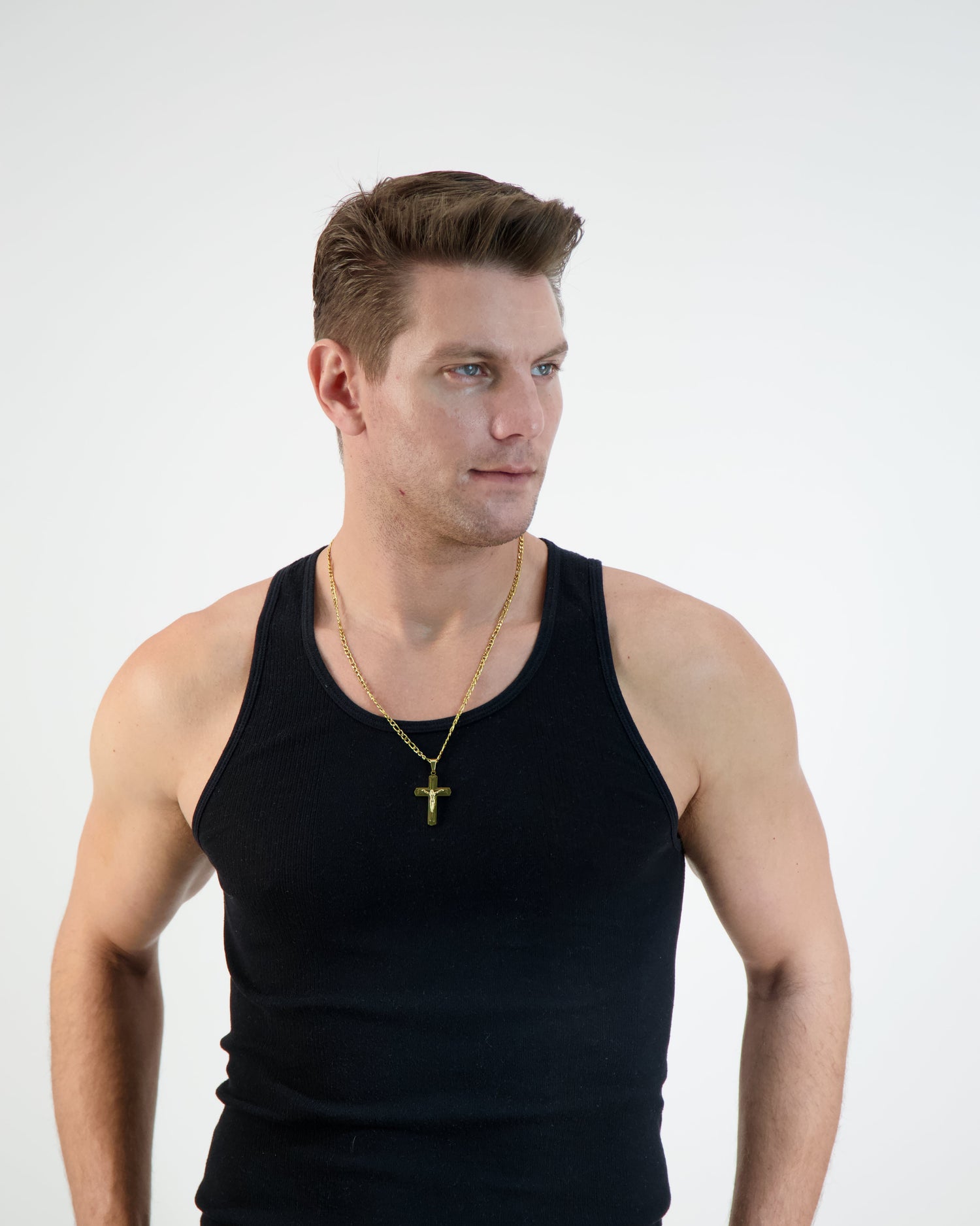 Elevate your style and express your faith with our classic crucifix cross pendant necklace. Discover the beauty of the Figaro chain and indulge in the radiant appeal of the 18K gold-plated stainless steel. Let this meaningful and sophisticated piece become a cherished addition to your everyday ensemble.