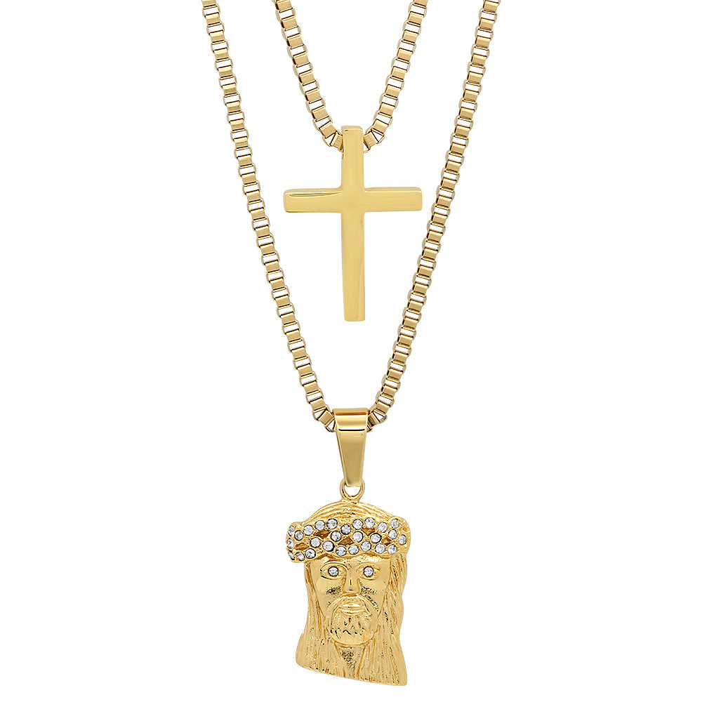 Elevate your collection with our double pendant necklace, showcasing a Jesus with Simulated Diamonds and a High-Polished Cross. This necklace serves as a perfect statement piece, reflecting your faith and adding a touch of elegance to your ensemble.